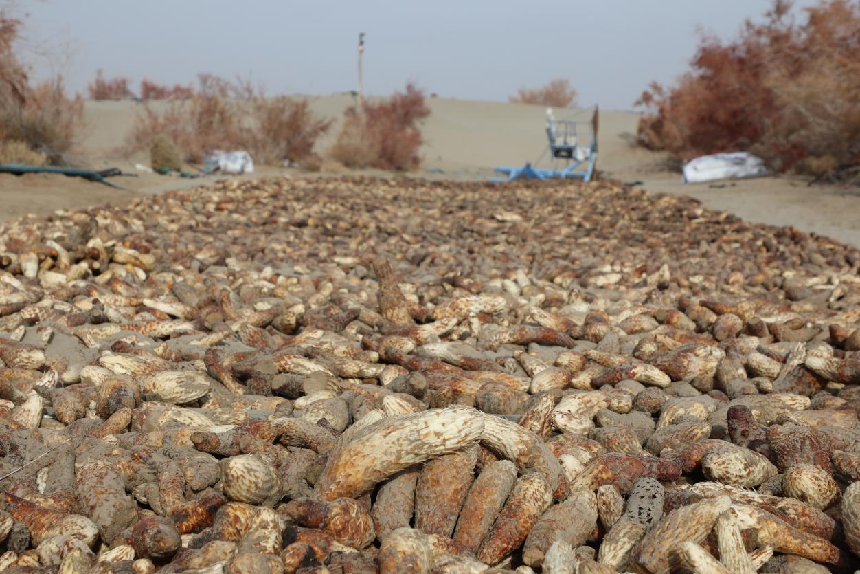 谈到收益,买吾兰掰着手指算了一笔账:新鲜肉苁蓉市场零售价每公斤45元,批发价每公斤20多元,晾干每公斤150元,10吨新鲜肉苁蓉可出2吨多干货,加上五月份晾晒出的200多公斤,今年可产2.3吨干货,总收益达34.5万元。