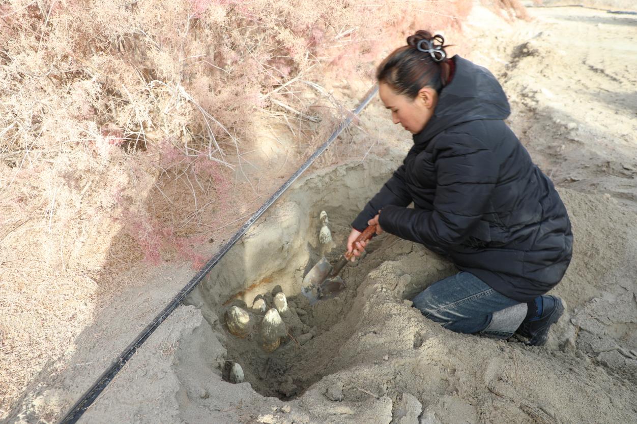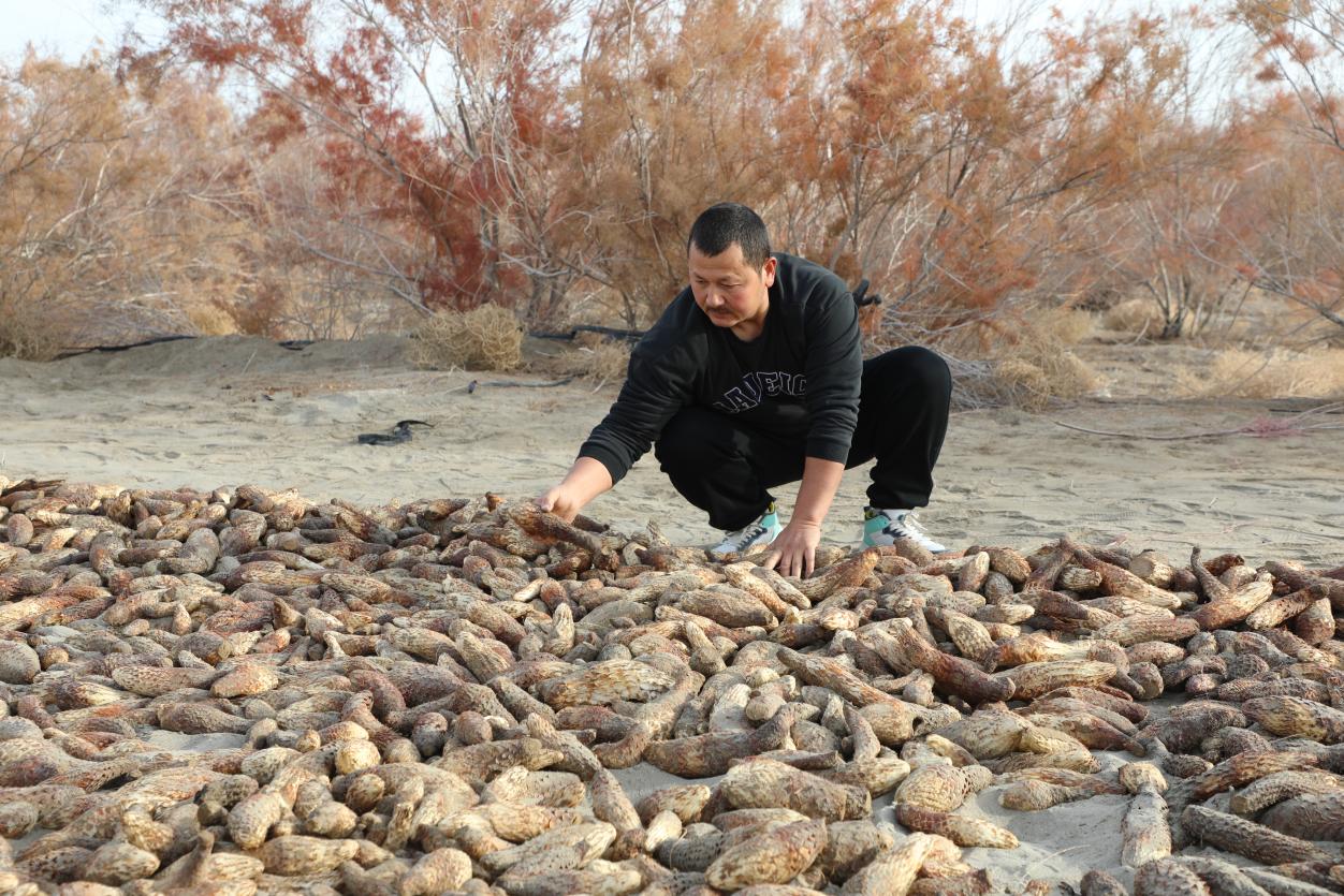 近日,在新疆兵团第一师阿拉尔市十一团花桥镇十四连附近荒漠上的红柳丛里,6名职工正在挖人工种植的肉苁蓉。看着眼前刚挖出的一堆堆肉苁蓉,职工买吾兰抹了抹脸上的汗水,咧开嘴笑了。