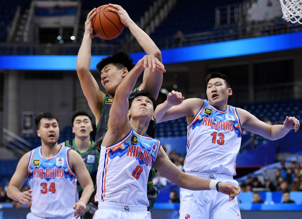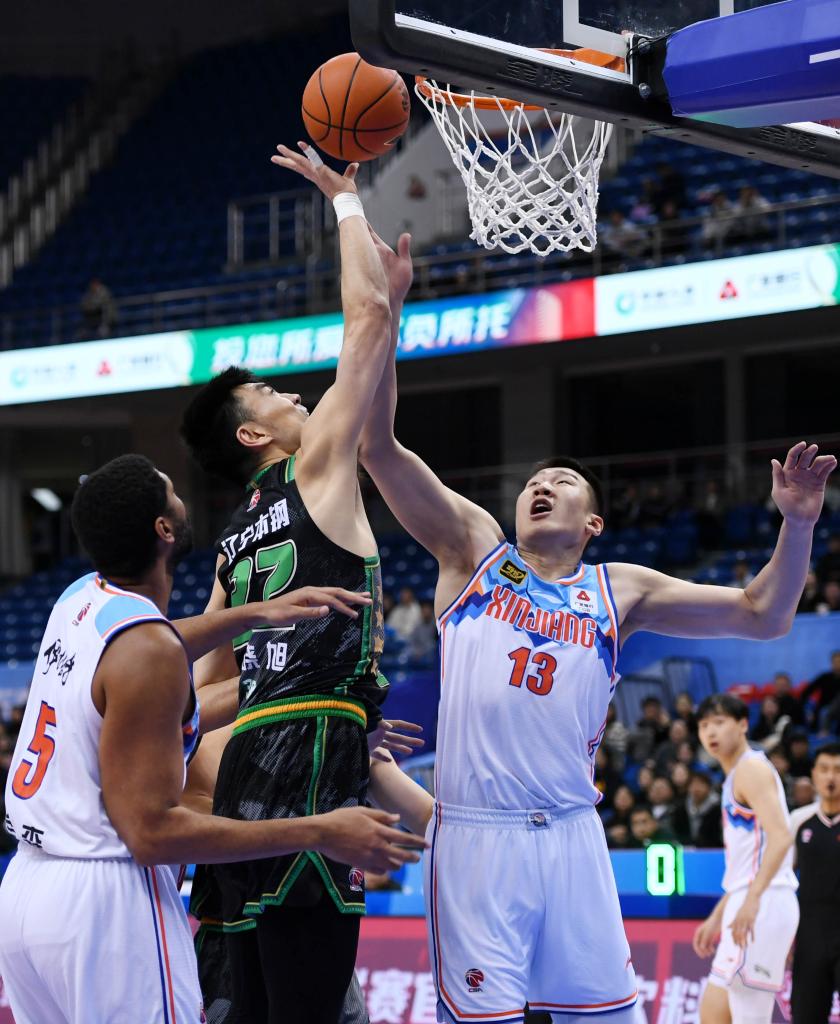 11月17日,新疆伊力特队球员李炎哲(前右)在比赛中防守辽宁本钢队球员李晓旭(前中)投篮。新华社记者 李紫恒 摄