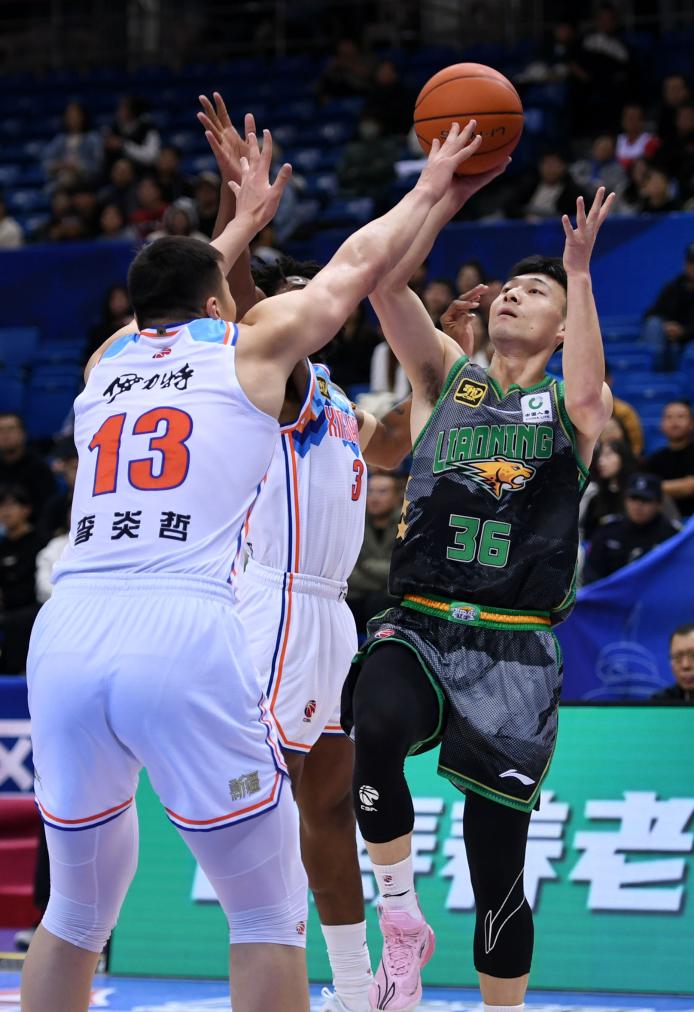 11月17日,辽宁本钢队球员张陈治锋(中)在新疆伊力特队球员曲笑宇(左)的防守下投篮。新华社记者 李紫恒 摄