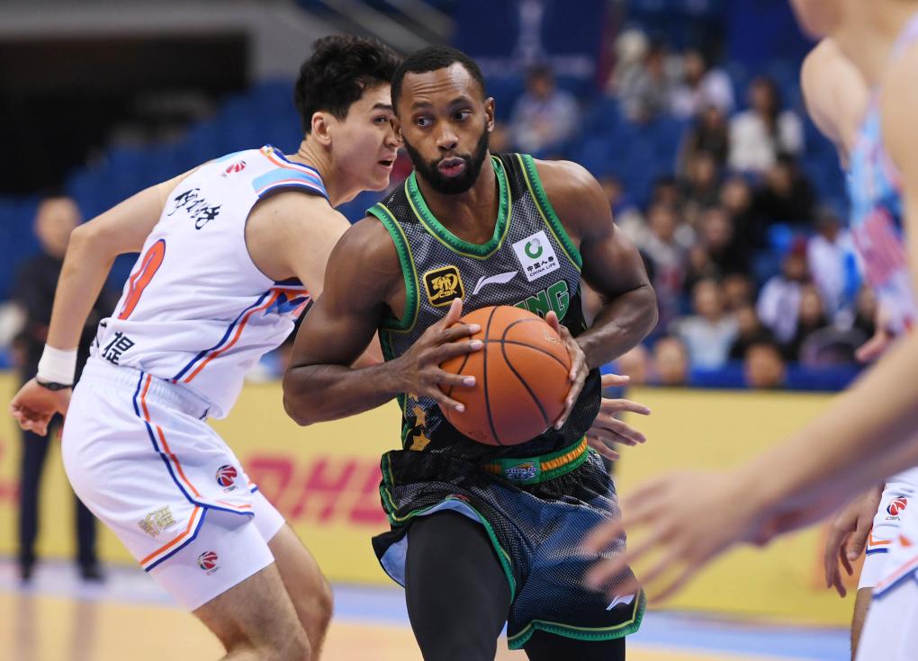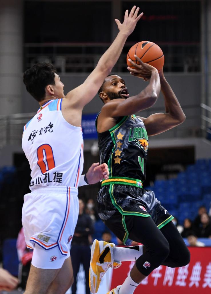 11月17日,辽宁本钢队球员弗格(右)在新疆伊力特队球员西尔扎提的防守下投篮。新华社记者 李紫恒 摄