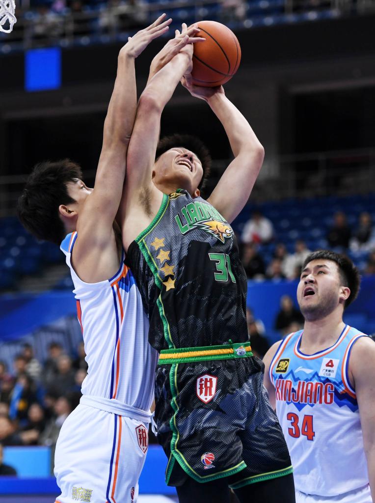 11月17日,辽宁队球员张陈治锋(上)在比赛中拼抢。新华社记者 李紫恒 摄