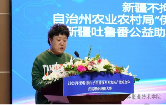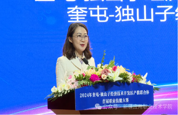 图为奎屯-独山子经济技术开发区党工委委员、纪工委书记、奎屯-独山子经济技术开发区产教联合体理事长张雁琴讲话