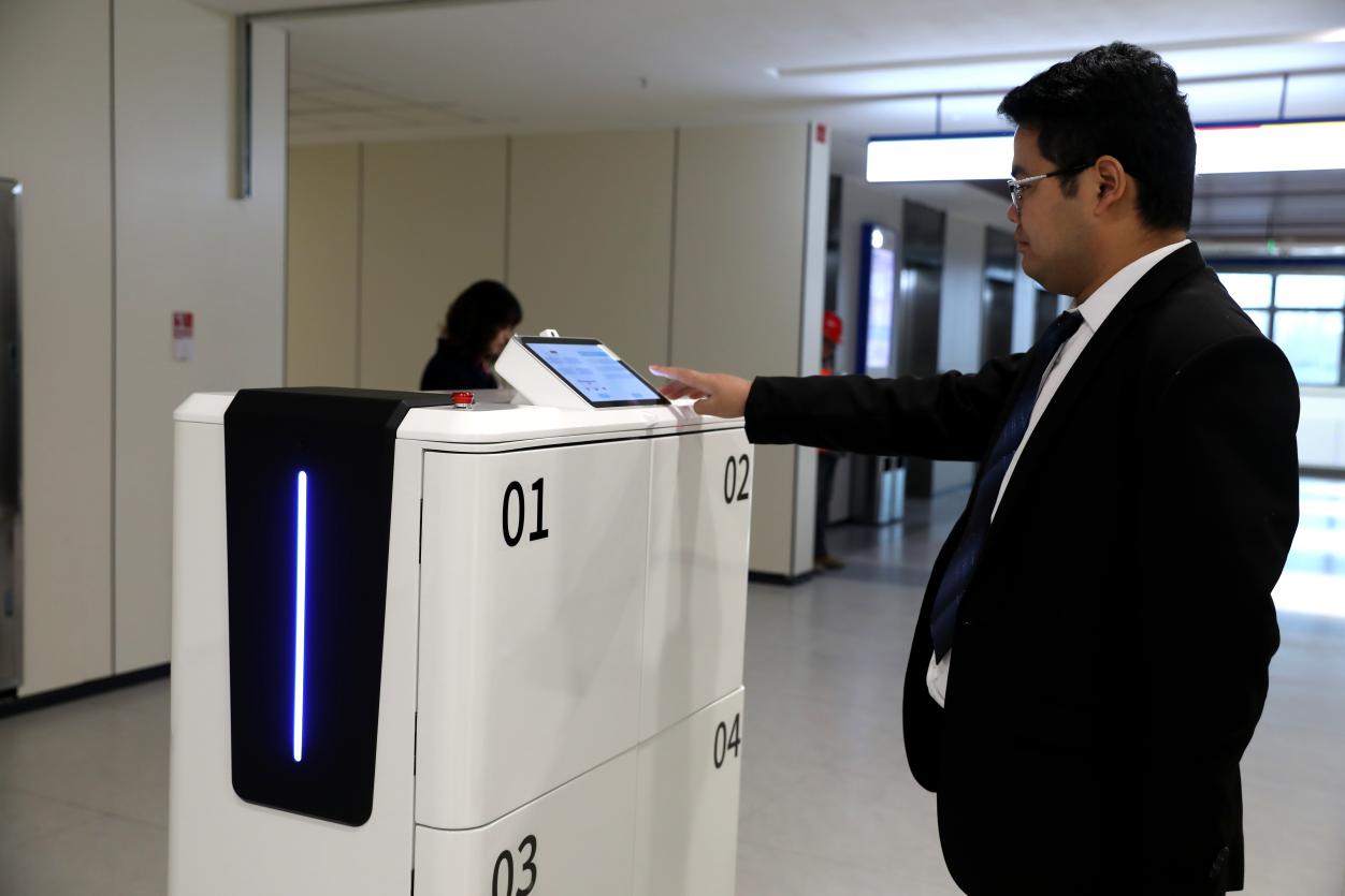 工作人员正在向智能配送机器人“大白”下达指令。王芳芳 摄