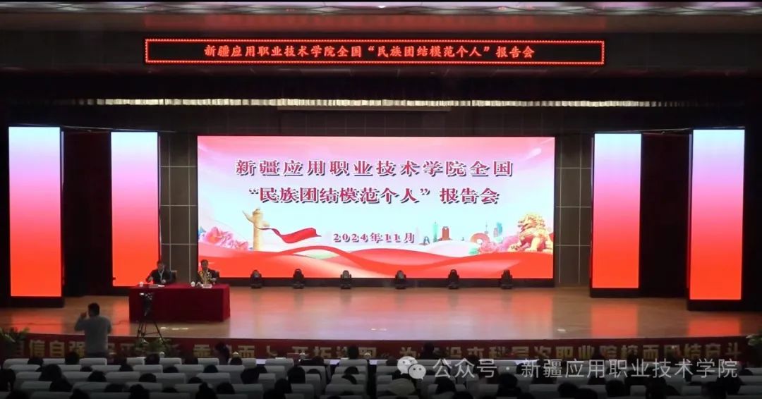 2024年11月27日下午,新疆应用职业技术学院开展“最美乡村医生”“全国民族团结进步模范个人”报告会,并荣幸邀请到“最美乡村医生”“全国民族团结进步模范个人”、学院护理与健康学院名誉院长居马泰·俄白克作报告。新疆应用职业技术学院党委副书记、院长叶列吾别克·那克斯别克及党委班子成员巴吾东·买买提、孔祥静、卡吾孜亚提·斯德克,学院全体教职工及各二级学院学生代表参加报告会。