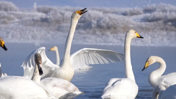 初冬时节,在新疆伊犁哈萨克自治州昭苏县湿地公园,数十只越冬天鹅在雾气蒸腾的河面嬉戏、觅食。水雾里,身姿优雅、体态婀娜的天鹅,或轻盈踏水,或翩翩起舞,成为一道亮丽的风景。