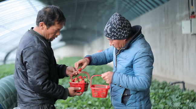 在草莓大棚里,工人们正忙着采摘、称重、搬运,一派繁忙景象。这些草莓采摘下来后立刻被送往水果店,确保新鲜上市。同时,也有客商亲自在棚里采摘,他们的到来不仅是对草莓品质的认可,也为合作社的发展带来了新的机遇。