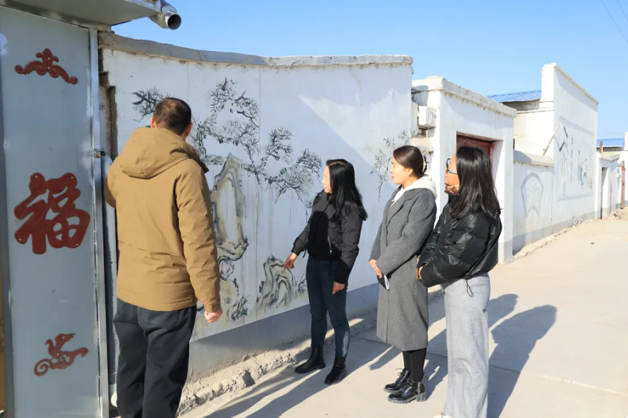 郭彩霞(左二)向连队“两委”成员展示自家院墙。