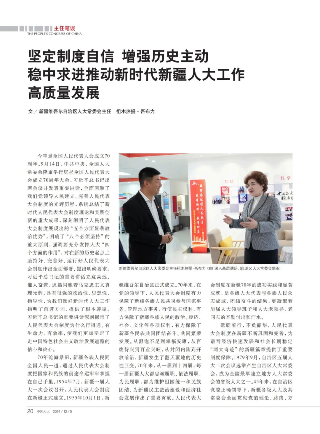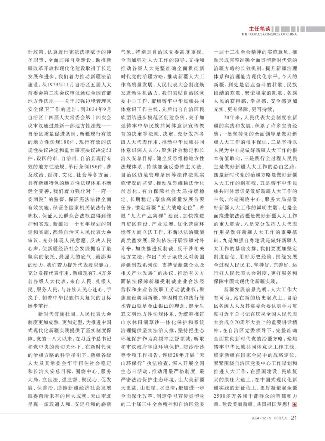 新疆发展前景光明,人大工作大有可为。站在新的历史起点上,自治区各级人大及其常委会要认真学习贯彻习近平总书记在庆祝全国人民代表大会成立70周年大会上的重要讲话精神,在自治区党委领导下,完整准确全面贯彻新时代党的治疆方略,聚焦铸牢中华民族共同体意识工作主线,锚定新疆在国家全局中的战略定位,紧紧围绕自治区党委中心工作谋划和推进人大工作,在强国建设、民族复兴的康庄大道上,在中国式现代化新疆实践的新征程上,更好凝聚起全疆2500多万各族干部群众的智慧和力量,建设美丽新疆、共圆祖国梦想!(新疆维吾尔自治区人大常委会主任 祖木热提·吾布力)