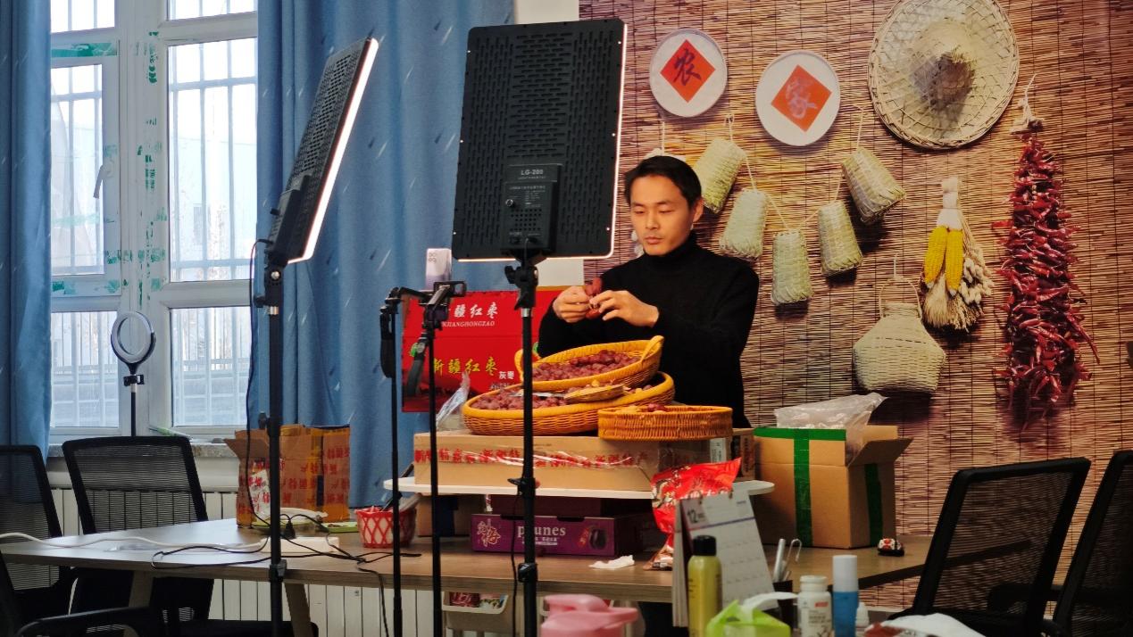 阿拉尔市胡杨树果业有限公司电商运营冀龙飞正在直播销售红枣。王芳芳 摄