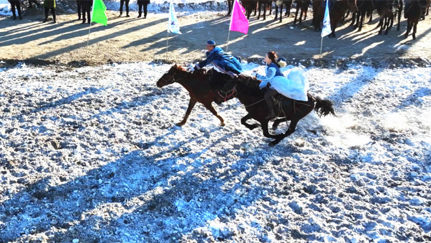 比赛的开始无疑将全场的氛围推向了高潮。姑娘追这一充满趣味与浪漫的项目率先登场。男女骑手们穿着传统的民族服饰,男子骑在马上,身姿略显潇洒又不失矜持,女子则带着羞涩又坚定的神情。他们并驾齐驱,男子在前,女子在后,在雪地上策马奔腾,男女骑手在追逐嬉戏过程中,诙谐与浪漫的氛围弥漫开来,周围的观众被逗得哈哈大笑,笑声在雪地上空回荡。