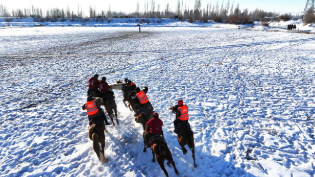 刁羊比赛则是一场力量与技巧的激烈较量。8支队伍的骑手们齐聚赛场,个个斗志昂扬。骑手们手持缰绳,目光紧紧锁定在场地中央那只作为“猎物”的羊,而后如汹涌的潮水般冲向场地中央,扬起高高的雪雾,场面十分壮观。抢到羊的骑手想尽办法摆脱其他骑手的纠缠,向着目的地奔去,其他骑手则紧追不舍,这是力量与速度的极致较量。