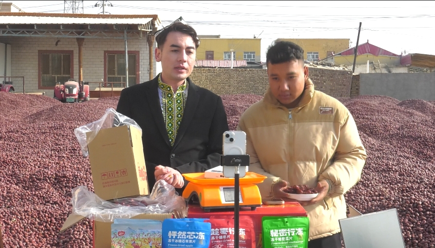 麦盖提县央塔克乡人民政府干部古丽米热·艾则孜说道:“今天我们开展‘直播助农带货’活动,主要是为了提高当地果农的收入,助力乡村振兴。通过直播平台,将红枣推向全国各地,拓宽销售渠道,助力群众的农产品走出去。”