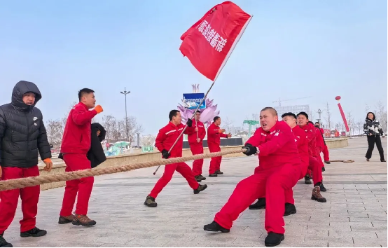 活动现场,冰上自行车、雪圈赛跑、陀螺、保龄球等比赛项目精彩纷呈,在这银装素裹的冰雪世界里,到处洋溢着欢声笑语。在拔河比赛现场,参赛队员们双手紧握粗绳,双脚用力蹬地,身体拼命后倾,中间的红绳成为全场瞩目的焦点,观众大声助威,加油声、呐喊声在雪地上回荡。
