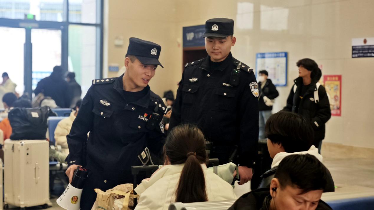 在阿拉尔火车站内,乌鲁木齐铁路公安局库尔勒公安处阿拉尔站派出所民警苏华(右一)和同事正在站内巡逻。王芳芳 摄