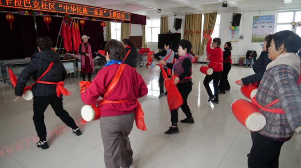 在霍尔果斯市兴城街道卡拉巴克社区,村民们正在排练安塞腰鼓。指导老师一声令下,激昂的鼓点响起,演员的身姿随着鼓点不断变换,踢腿、跳跃、转身,红绸在空中飞扬,仿佛一片燃烧的火焰,将安塞腰鼓的豪迈与奔放展现得淋漓尽致。