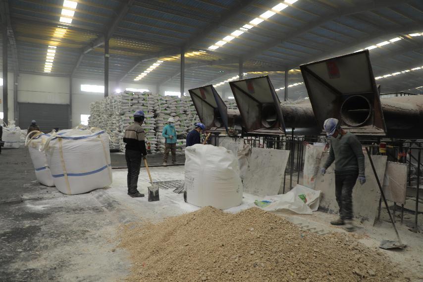 在新疆台沃肥业科技有限公司生产加工车间,机器轰鸣,工人正在化肥生产线上忙碌,加工原料通过入料粉碎、滚筒造粒、多级烘干等工序,化肥生产完成,日产量400吨左右。