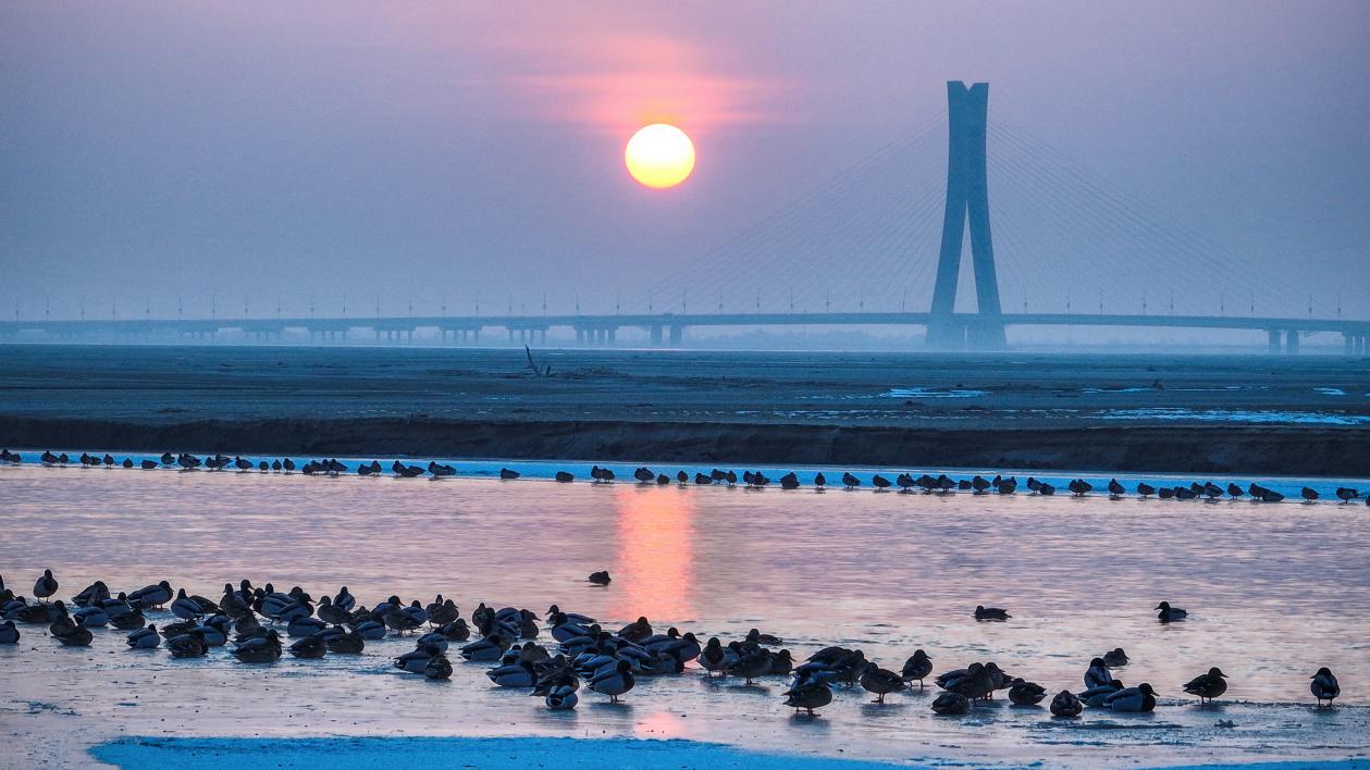 日落鸟群聚浅水,大桥高耸映霞光。彭宇轩 摄