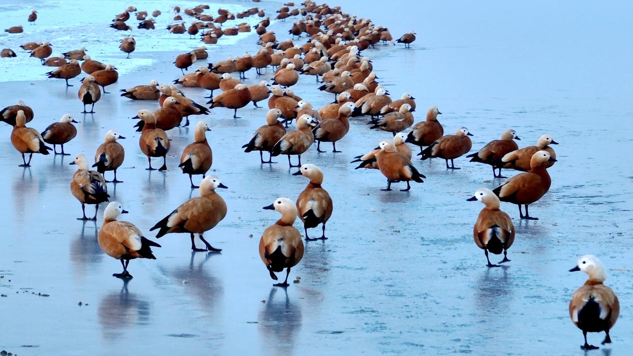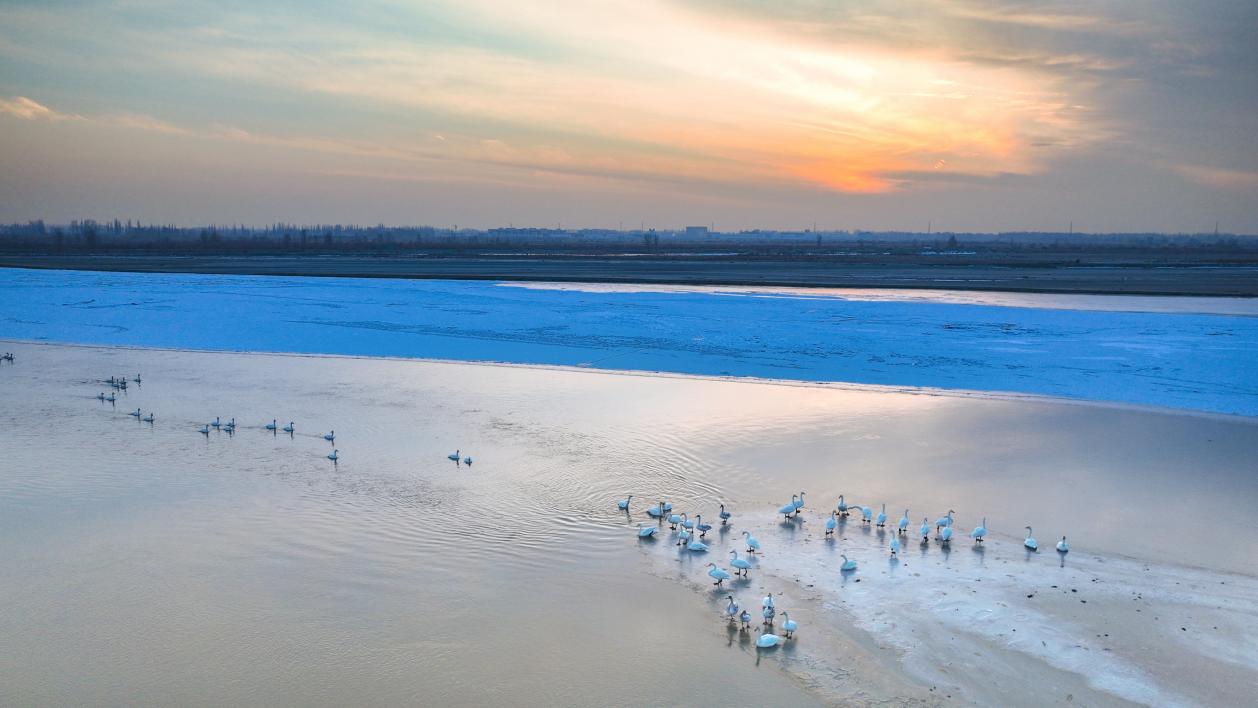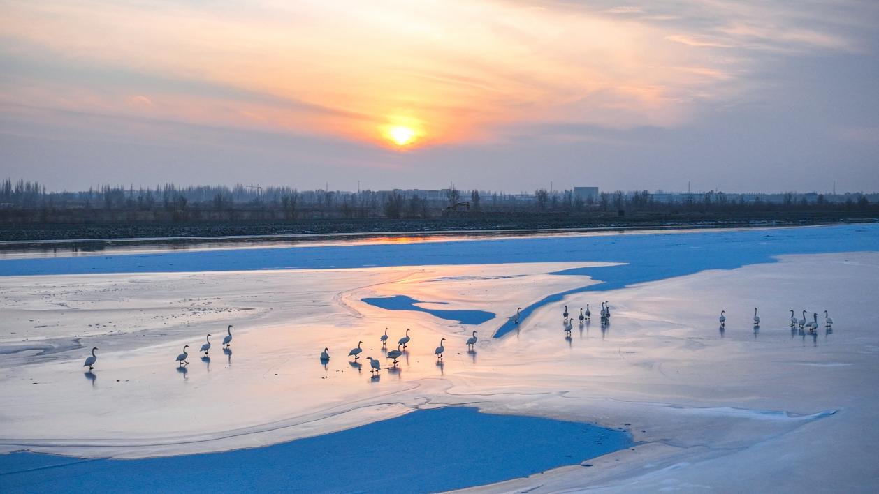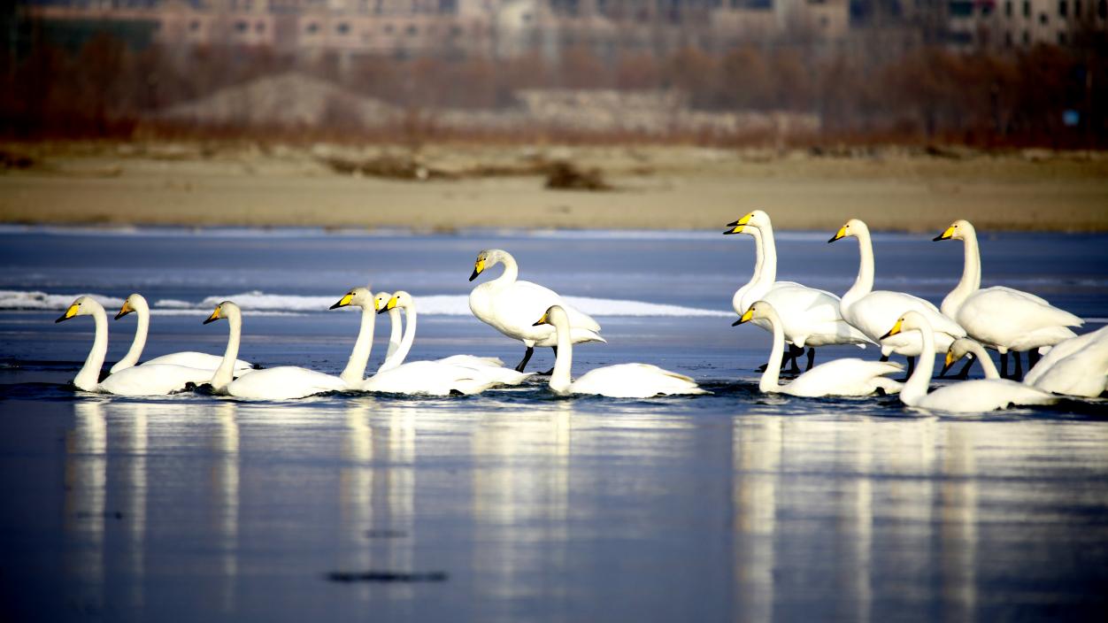 当然,在这里不仅有身姿优雅的白天鹅,还有成群结队的赤麻鸭等,三两成群,欢快游动,溅起层层水花,将冬日的寂静彻底打破,与远处的城市高楼和蜿蜒的河水相映成趣,共同绘就了一幅人与自然和谐共生的唯美画卷。这里处处皆景,步步入画,叫人目不暇接,沉醉不知归,更让阿拉尔市平添了一幅“冬日江南水乡”的韵味。