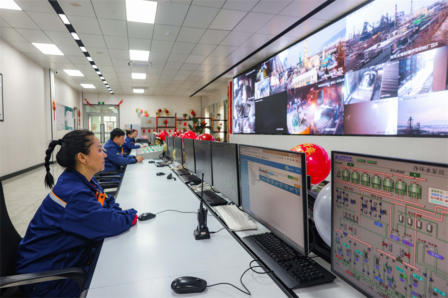 1月21日,新疆伊犁钢铁有限责任公司工人在炼铁厂中控室内屏气凝神,监盘操作。