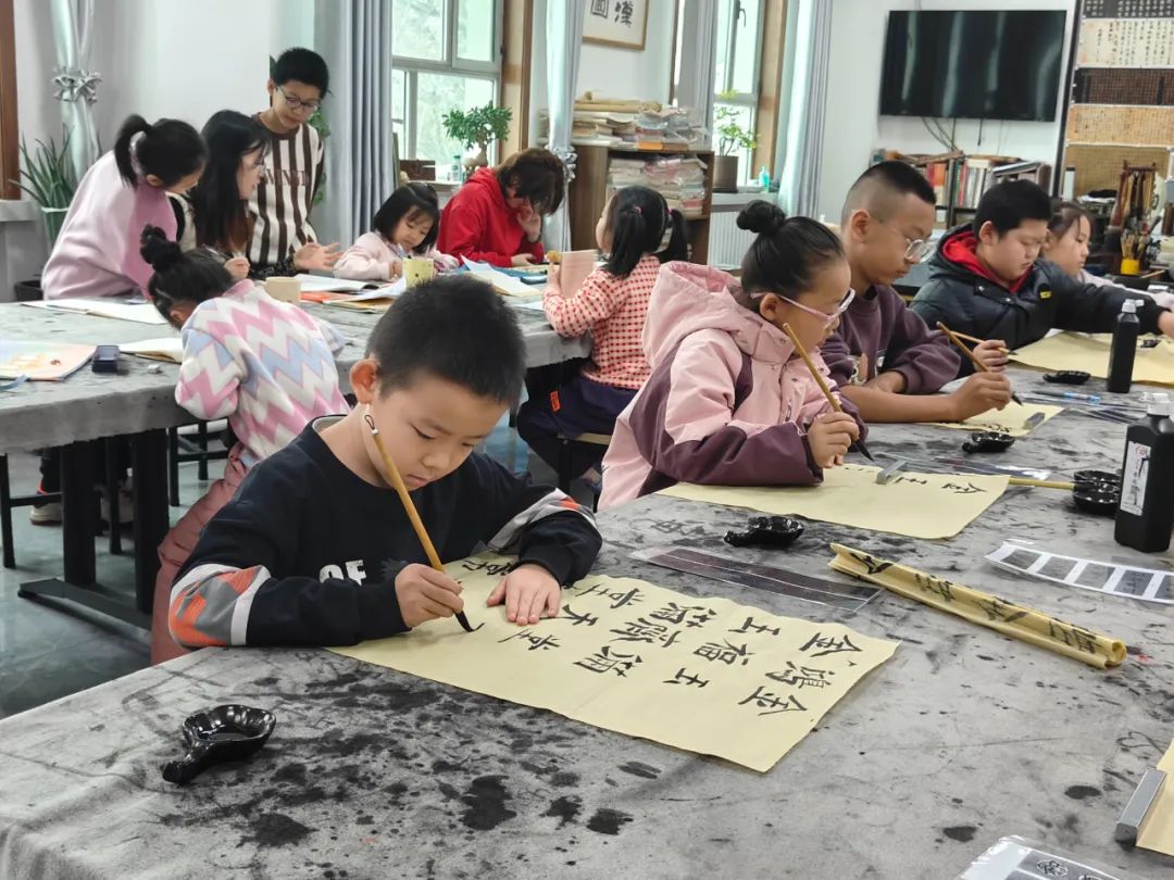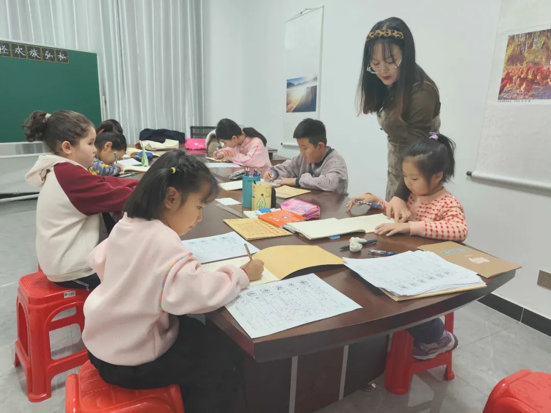书法教师安东正在给孩子们讲解毛笔书法的写作要领。孩子们听得认真,并纷纷根据老师的指导,认真调整自己的姿势,一笔一画认真书写,反复练习。