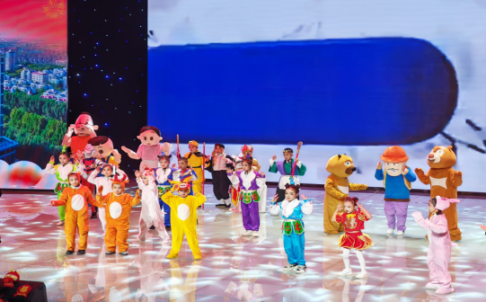 晚会在创意节目《那时童声》中梦幻开场,《葫芦兄弟》《西游记》《熊出没》等经典动画画面接连闪现,可爱的孩子们扮演着对应经典角色蹦跳登场。台下观众惊喜不已,现场气氛热烈。