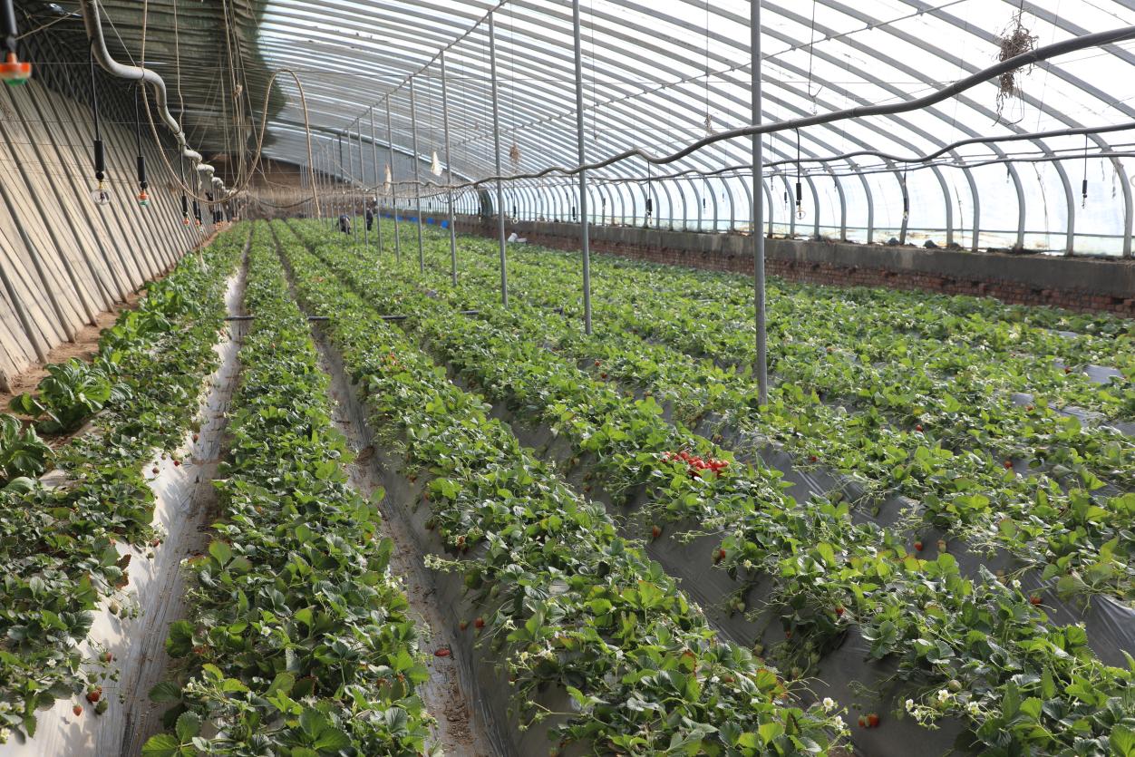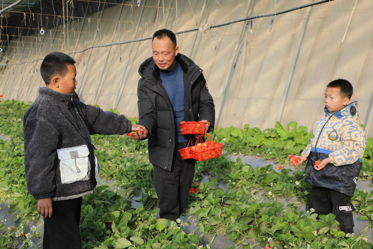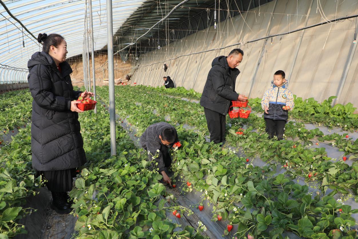 温室大棚内一垄垄植株排列整齐,绿叶间点缀着一颗颗红宝石般鲜艳的草莓。刘政庭和家人将成熟的草莓摘下,放进篮子里,动作轻盈而熟练。