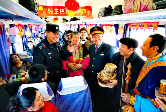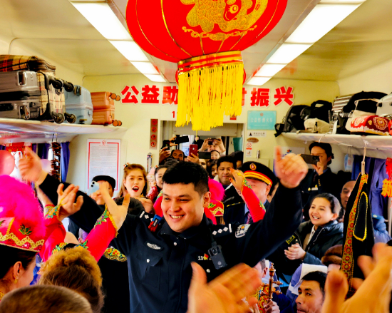 1月17日,在“和田玉龙号”列车巴扎年货节活动中,乌鲁木齐铁路公安局库尔勒公安处乘警支队民警与旅客们一起跳起麦西来甫舞蹈,营造欢乐详和迎春节的氛围。武陇慧 摄