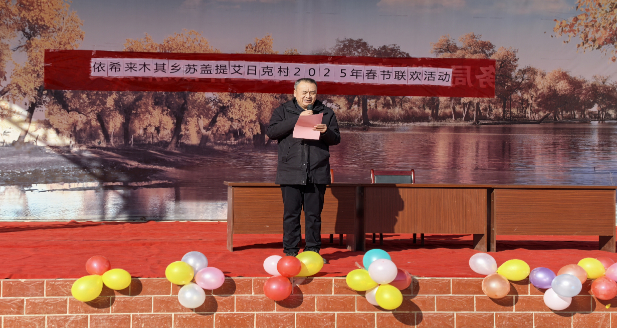 联欢会在苏盖日克提艾村大舞台隆重举行。活动伊始,自治区税务局驻温宿县依希来木其乡苏盖提艾日克村工作队第一书记文岗发表了热情洋溢的节日致辞。他代表驻村工作队向全村父老乡亲致以最诚挚的新春祝福,并回顾了过去一年村里取得的各项成就。文岗书记表示,这些成绩的取得离不开每一位村民的辛勤付出和无私奉献,他鼓励大家在新的一年里继续发扬团结互助、勤劳勇敢的精神,共同创造更加美好的未来。