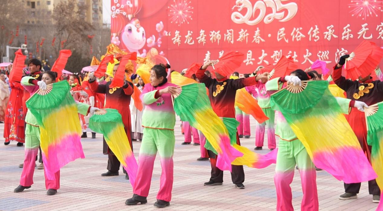 在喧天的锣鼓声中,社火表演正式拉开序幕,宽敞的街道一时变成了偌大的舞台,参演的各族干部群众身着盛装、精神抖擞、神采飞扬、意气风发。13时,鼓点激越,鼓声震天,伴随着阵阵锣鼓声,社火演出正式开始,丰富多彩的节目轮番上演,为全县各族人民群众献上了欢乐喜庆、祥和美好的节日祝福。
