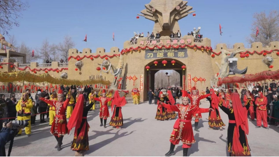 1月30日,在阿瓦提县刀郎部落景区,身着传统服饰的各族群众,以热情洋溢的笑容和极具民族特色的舞蹈,迎接每一位前来的游客,让大家沉浸在浓郁的春节氛围中。
