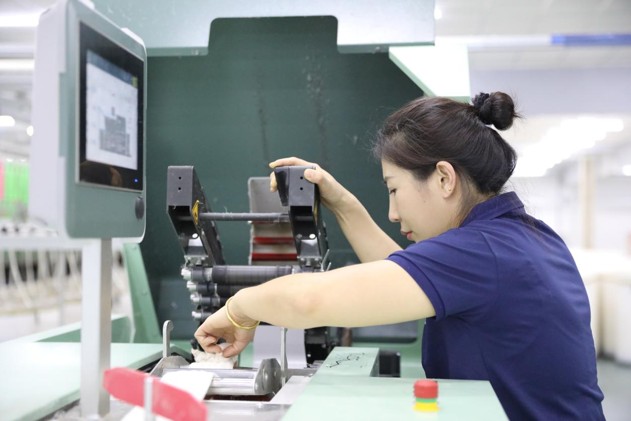 步入生产车间,仿若踏入一个高速运转的精密机械世界。清棉、梳棉、精梳、并条、粗纱、细纱、络筒等工序紧密相连,一环扣一环,构成一条高效的生产流水线。在经过一道道精细的“打磨”工序后,最终在络筒工序华丽变身,成为高品质的成品棉纱。16支、21支、32支、40支等紧密纺棉纱源源不断地从生产线上产出,这些棉纱质地优良,光泽度好、强度高,深受市场青睐,订单纷至沓来。