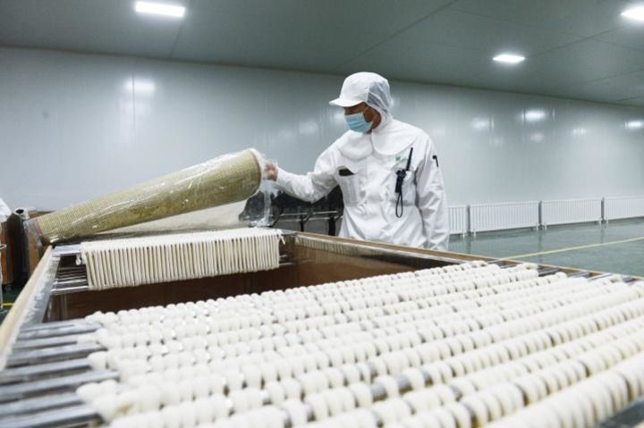 在新疆奇台县腰站子村丰裕农业服务合作社挂面车间,工作人员在检查面条生产情况。(2021年8月24日摄)。新华社记者 许晟 摄