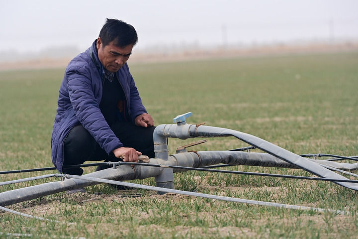 在新疆阿克苏市柳源镇瑞丰村,种植户在小麦地里检查滴灌系统(2024年3月21日摄)。新华社记者 丁磊 摄