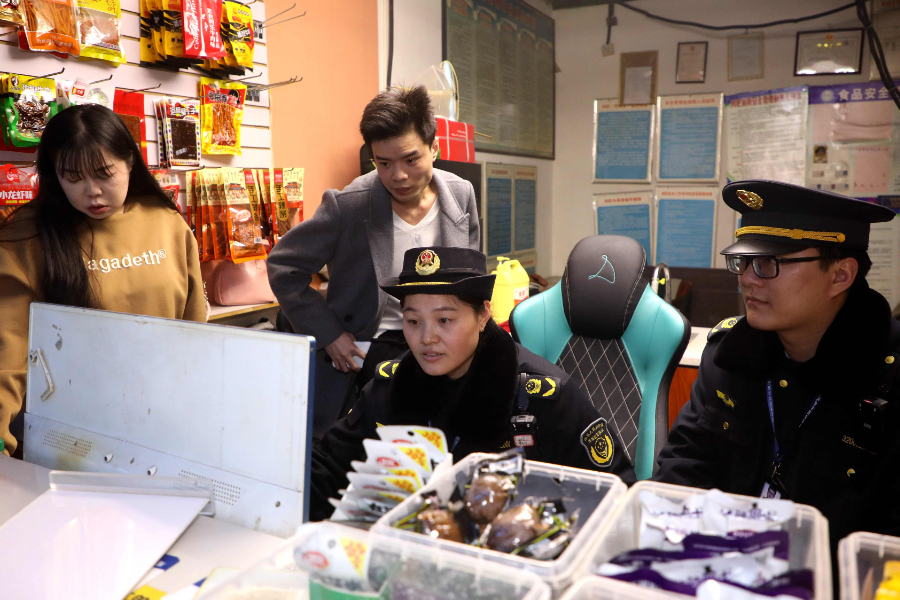 执法人员通过电脑系统仔细查验相关信息。林国强摄
