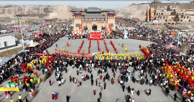 2月12日,由各乡(镇)、县文化馆等组成的社火队在温宿古城依次登台展演,这是舞龙舞狮和秧歌舞表演。李越进 摄
