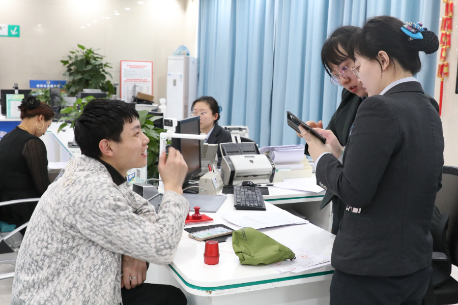 六团双城镇二连职工徐勇正在办理贷款业务。李宇 摄