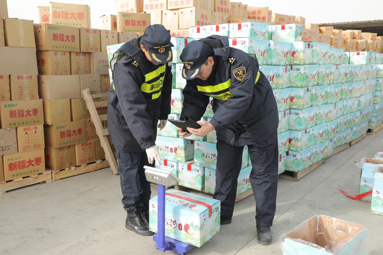 近日,记者在新疆阿拉尔市芳馨情果品有限公司看到,海关工作人员正在对一批33吨的干制红枣进行查验。这批红枣初步查验合格后,将被送往乌鲁木齐进行进一步查验,通过后即可发往越南。这是该企业2025年出口的第29批干制红枣,货值达1100万元。