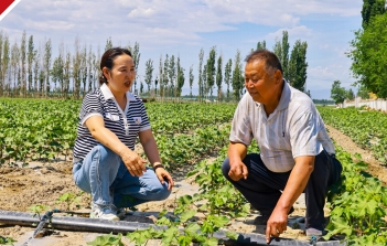 吴文秀代表(左)在伊吉林莫墩村的棉田内查看节水灌溉情况。(代表供图)