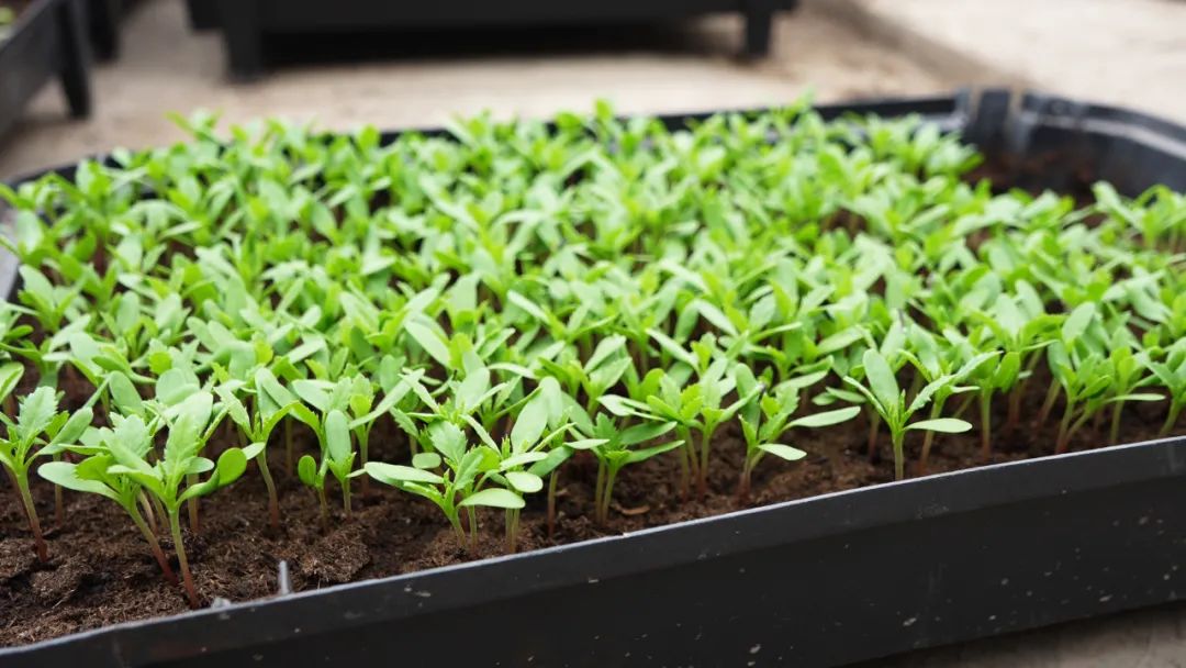 走进育苗大棚,映入眼帘的是排列整齐的各色花卉幼苗。它们在阳光照耀下,惬意地舒展着嫩绿的叶片。园艺师们在育苗盆之间来回穿梭,不时停下脚步给幼苗浇水。大棚正中间挂着温度计,实时显示着棚内的温度。