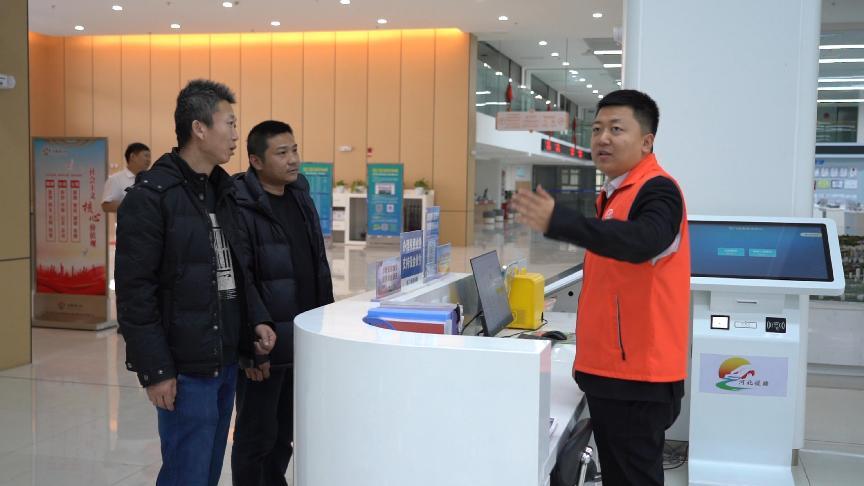 “小兵帮办”工作人员帮助办理业务的群众介绍业务窗口。