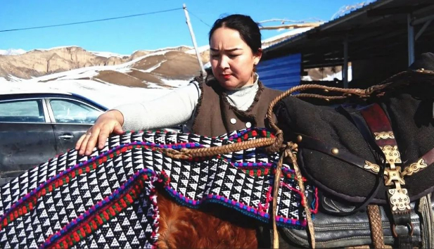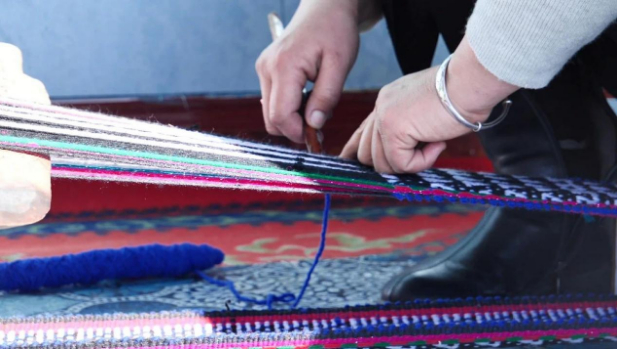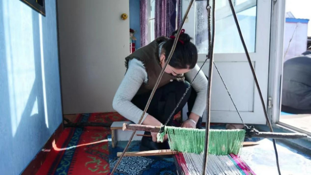 (居里都孜·叶尔卡孜在编织马鞍毯)