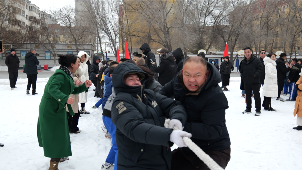 雪地拔河比赛现场气氛热烈非凡,参赛选手们紧紧握住绳索,身体后仰,双脚稳稳扎根雪地。现场呐喊声、加油声此起彼伏,响彻校园。