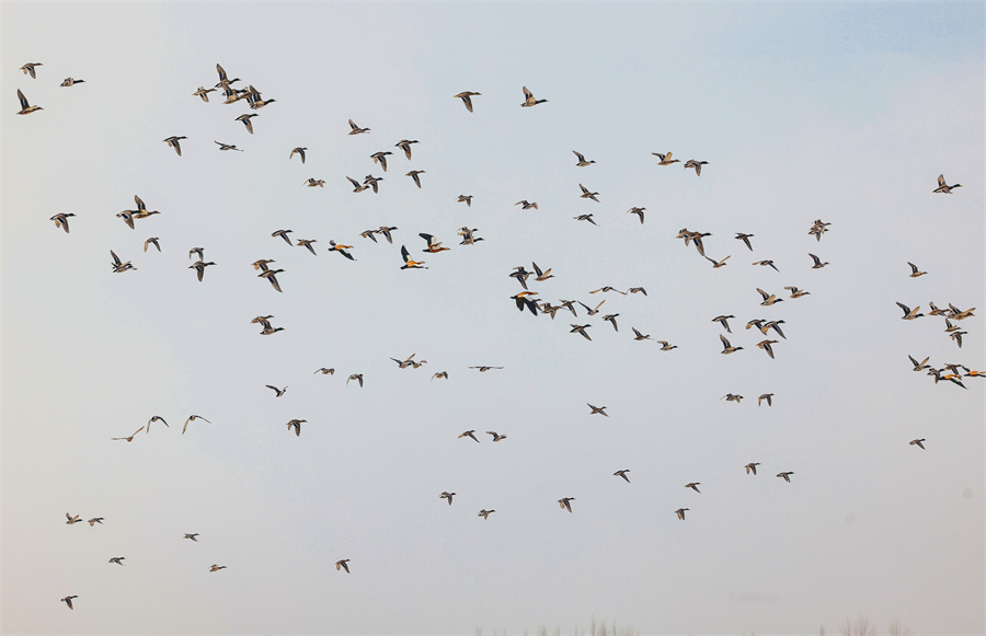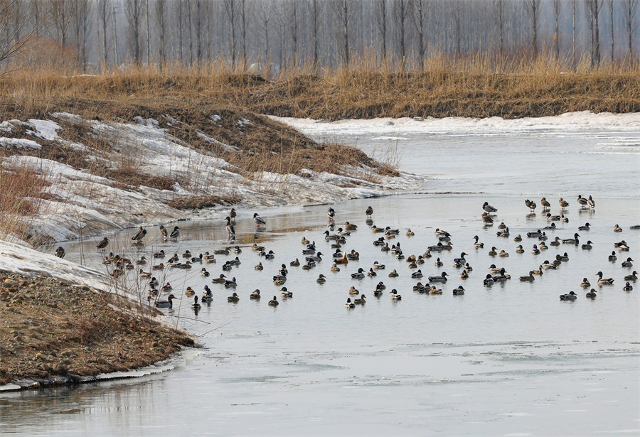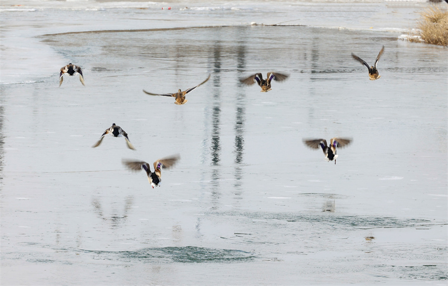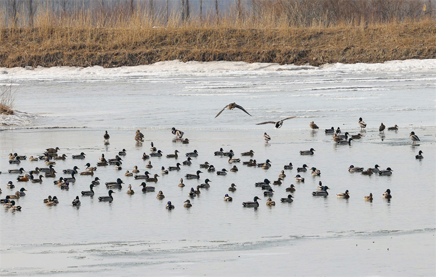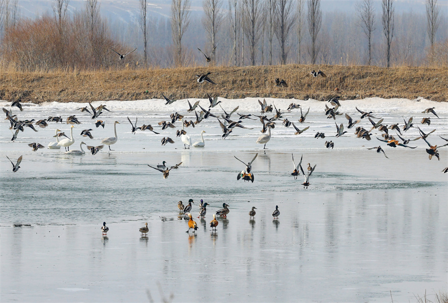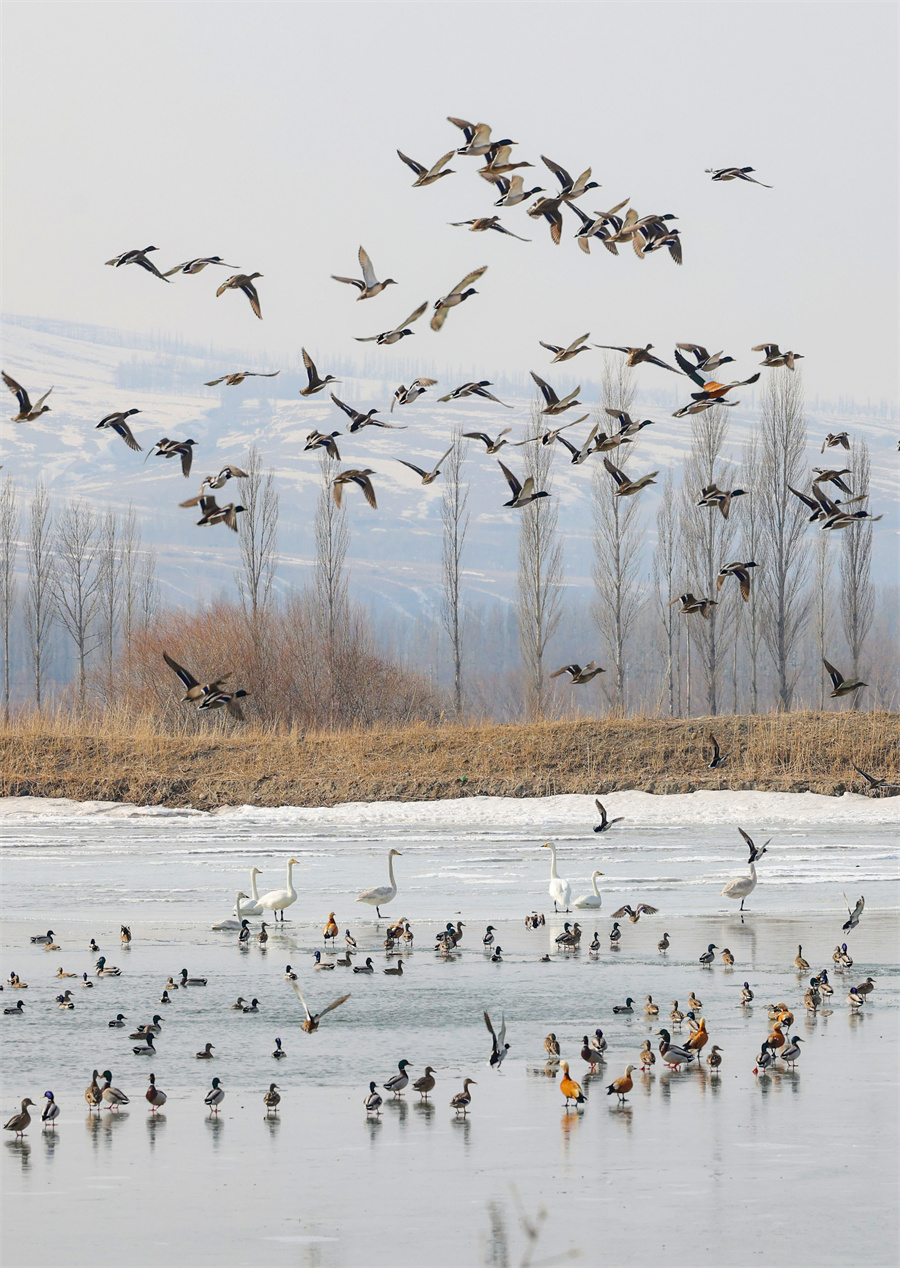近日,随着气温逐渐回升,位于新疆新源县坎苏镇的“鱼儿山风景区”人工小湖呈现出一幅独特的景象:湖面处于半冰半水状态,一群群野鸭、天鹅、赤麻鸭等在此栖息,为这里增添勃勃生机。它们成群结队地在同一湖面上,或悠然漂浮,或埋头觅食,自在又惬意。这时,若有人不经意靠近,瞬间打破这份宁静,呼呼啦啦,瞬间成群飞起。一时间,湖面上空满是它们矫健的身姿,翅膀扇动的呼呼声,交织成一曲激昂的乐章,场面蔚为壮观。
