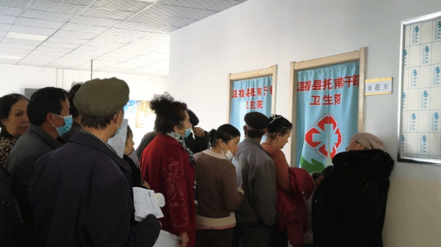群众在温宿县托甫汗镇卫生院排队依次进行全民体检。张佳宁 摄