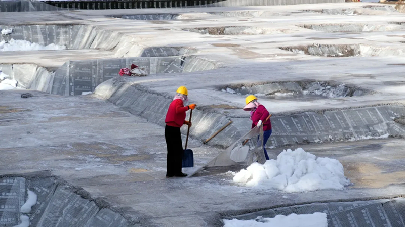 (工人正在整理设备、清理积雪)