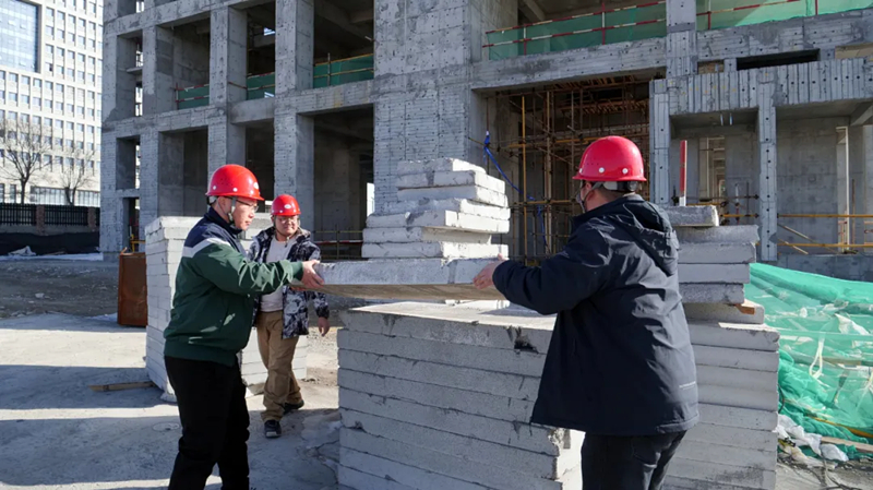 在霍尔果斯综合保税区国际技术标准检测检验中心建设现场,工人们正在搬运钢管和泡沫板。该项目总投资2亿元,总建筑面积30000平方米,分为地下1层地上17层,包括亚欧技术标化研究中心、进出口粮油检验检测中心、进出口货物检验检疫中心及相关配套附属设施,建成后可为企业提供各种技术标准的检测和认证服务。