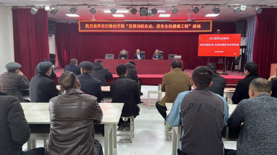 图为3月8日,自治区地质调查院驻托乎拉乡托万克库尔巴格村工作队聘请专家为全体村民开展了一场生动实用“功能农业、富硒水稻种植技术”讲座活动(马玉周 摄)