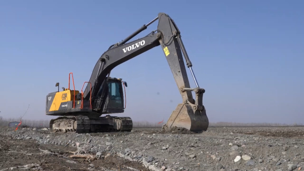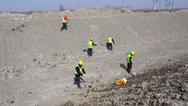 3月18日,在沙湾市大泉乡中泉村的优质棉基地建设项目现场,一台大型挖掘机正在进行田间道路路床平整工作,数名施工人员正在平整沉砂池边坡,整个现场呈现一派繁忙的施工景象。