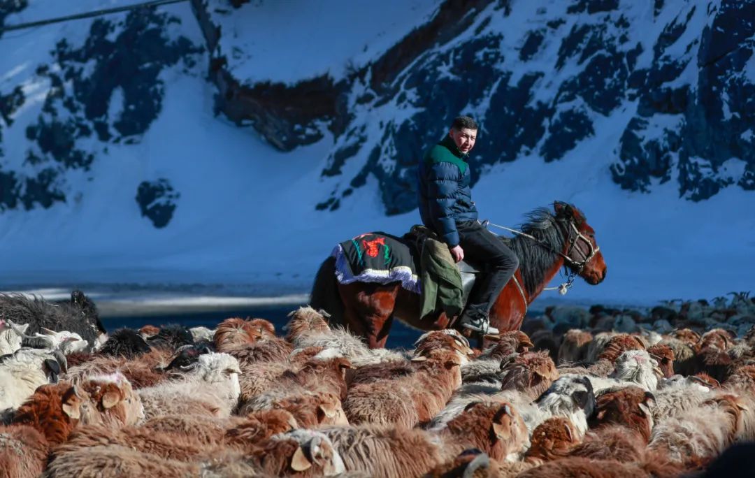 3月15日,在最后一个补饲点的山道上,我们见到了牧民开布尔·居马江和他的340只羊。